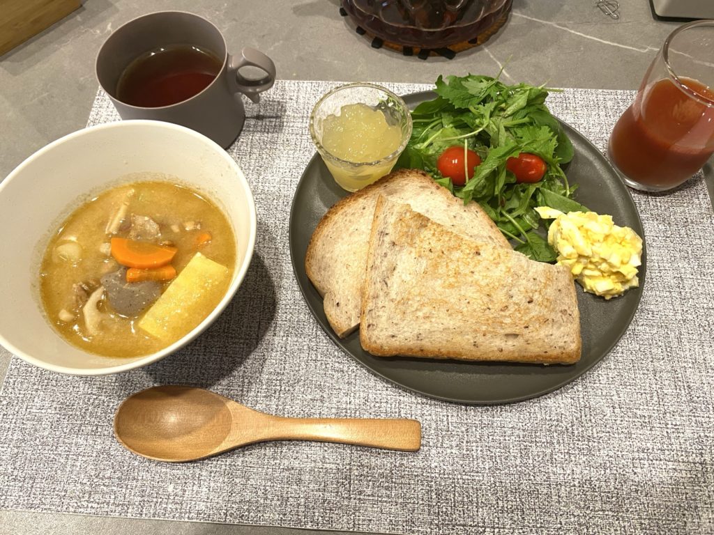 主婦に戻る 2025.10.1 未分類 5:45起床、 朝食作り始めます。 とりあえず野菜を食べさせときゃなんとかなるやろ〜作戦で😆 豚汁で決まり! あ、 今朝はパンだった🫢 器を変えればミソスープに✨ 16穀パン、りんごゼリー、マヨ卵、 トマトジュース。 さぁ、召し上がれ🙏 未分類 だから太る前の記事 ピティナピアノステップわが家の新しい活用法次の記事